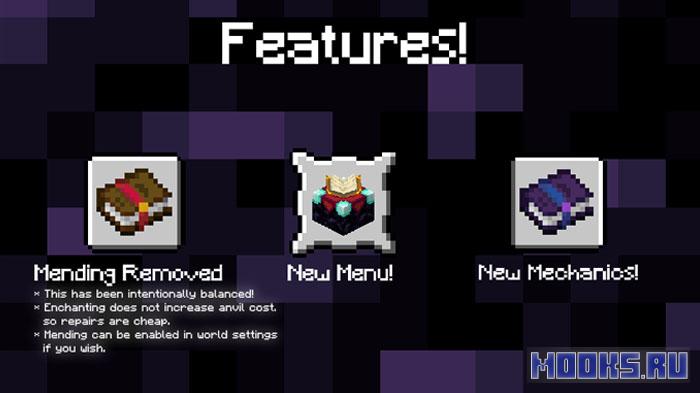 Модификация также перерабатывает механику ремонта и обновления экипировки. Зачарование Mending недоступно по умолчанию, поскольку оно нарушает баланс и убирает необходимость создавать новые инструменты. Но если нужен классический вариант, мод позволяет включить починку через настройки мира или команду, в зависимости от версии Minecraft. При этом стоимость ковки снижена и не возрастает с количеством чар, что убирает необходимость бесконечной починки и опыта.